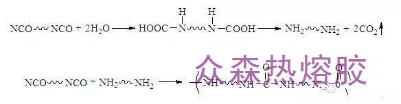 在第一個(gè)階段,PUR與普通熱塑性熱熔膠一樣,膠黏劑加熱熔融,施膠于基材上后,冷卻凝聚產(chǎn)生初粘強(qiáng)度;在濕固化階段,PUR中的-NCO主要與空氣中的濕氣發(fā)生擴(kuò)鏈反應(yīng),其反應(yīng)原理如下式: